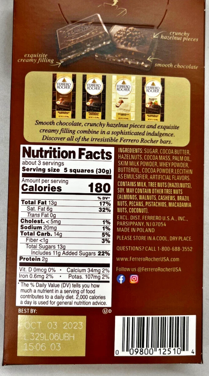 Ferrero Rocher Milk Chocolate Hazelnut Bar 3.1 Oz PACK EXP 05/2024