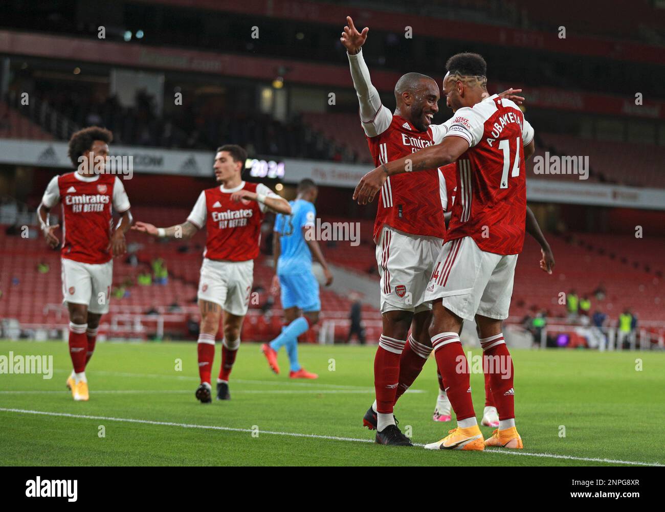 Arsenal’s Alexandre Lacazette celebrates with Arsenal’s Pierre